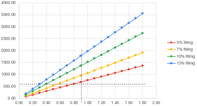 The UCIL Kiln has a designed RPM of 1.8 and diameter and length of 3.8, 60 m. The theoretical maximum capacity of the kiln with 13% Kiln filling is ~3500 TPD. Since UCIL team is targeting 1100 TPD, the factory does not need to change the drive system of the kiln to reach the designated throughput.